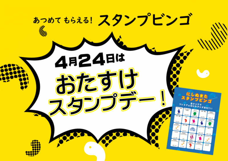 今月からスタートした、スタンプビンゴ。来園や体験学習、イベント参加に応じでスタンプを押します。スタンプがタテ・ヨコ・ナナメにそろえばビンゴ!1ビンゴ、2ビンゴ、3ビンゴ、コンプリートでプレゼントがあります。 毎月24日は、にしぬまたの日。4月24日、はじめての「おたすけスタンプデー」がやってきます。おたすけスタンプデーは、期日が過ぎてしまったマスにスタンプを1個プレゼントします。スタンプが増えれば、ビンゴの確立アップ!上手に使って、たくさんビンゴを作ってね。スタンプビンゴの用紙は、ぬまりん館の受付で配布しています。 ※これまでの体験スタンプカードは、引き続き利用できます。体験学習の受付時にご提示ください。ビンゴカードと併用可です。※おたすけスタンプデーでも、空いているマスの状況によってはスタンプが押せない場合もあります