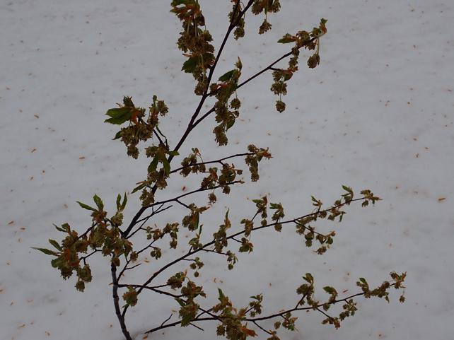 2日前の降雪で榎倒れがめだちます。ブなの開花時と重なり、その上に重くのしかかったのです。混芽えの影響はないのだろうか。