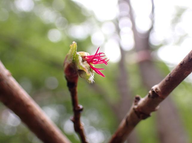 霧雨の中でしたが27名の参加でのイベントになりました。ツノハシバミの雌花がまさに紅色に映えていました。
