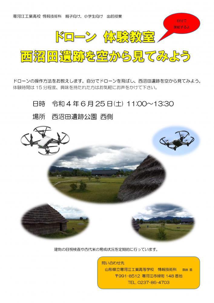 寒河江工業高校情報技術科の高校生が、ドローン操縦の体験教室を開催します。操縦は高校生が教えてくれます。小学生でもすぐに覚えられますよ。自分でドローンを飛ばして、西沼田遺跡を空から見てみよう!どうぞお気軽にご参加ください。 日時 令和4年6月25日(土) 11:00〜13:30 (体験時間は15分程度) 場所 天童市西沼田遺跡公園