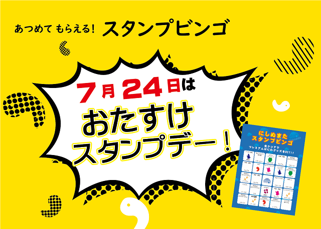 4月からスタートした、スタンプビンゴ。来園や体験学習、イベント参加に応じでスタンプを押します。スタンプがタテ・ヨコ・ナナメにそろえばビンゴ!1ビンゴ、2ビンゴ、3ビンゴ、コンプリートでプレゼントがあります。 毎月24日は、にしぬまたの日。おたすけスタンプデーは、期日が過ぎてしまったマスにスタンプを1個プレゼントします。スタンプが増えれば、ビンゴの確立アップ!上手に使って、たくさんビンゴを作ってね。スタンプビンゴの用紙は、ぬまりん館の受付で配布しています。 ※これまでの体験スタンプカードは、引き続き利用できます。体験学習の受付時にご提示ください。ビンゴカードと併用可です。※おたすけスタンプデーでも、空いているマスの状況によってはスタンプが押せない場合もあります。