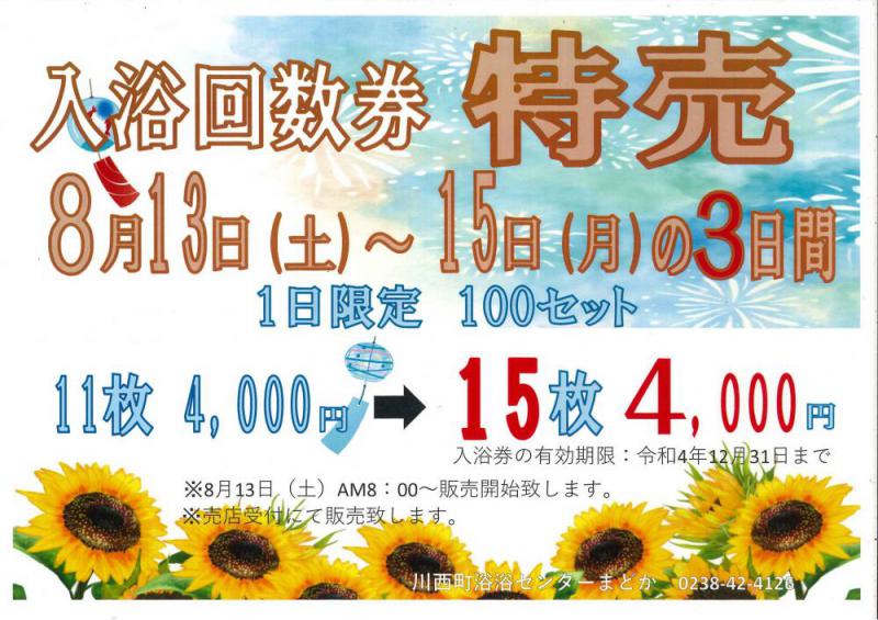 ●まどか温泉回数券お盆特売!!