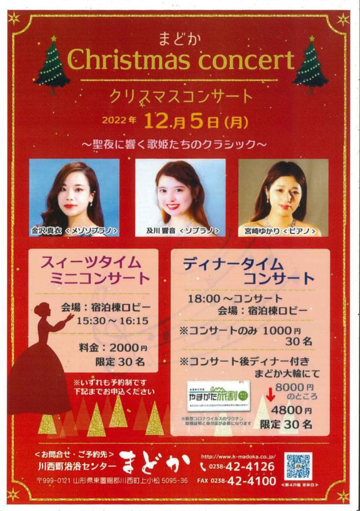 12月5日(月) クリスマスコンサート開催会場:宿泊棟ロビー◎1部 15:30〜16:15 定員:30名 スイーツタイムミにコンサート:料金:2,000円◎2部 18:00〜 ディナータイムコンサート ※コンサートのみ 1,000円 30名 その後大輪にてディナー ※やまがた旅割コンサート利用のため、ワクチン接種証明と身分証が必要となります。 旅割利用で 8000円の所→4,800円となります。 限定:30名で、クーポン券はコンサート代、当日のお飲み物代使用となります。★夏の「フレンドリークリニック」で川西で合宿して学んだ成果をクリスマスに披露します。素敵なクラシックのひと時とディナーをぜひ、お楽しみください。※予約制となります。ご予約は0238-42-4126 までお申し込み下さい♪