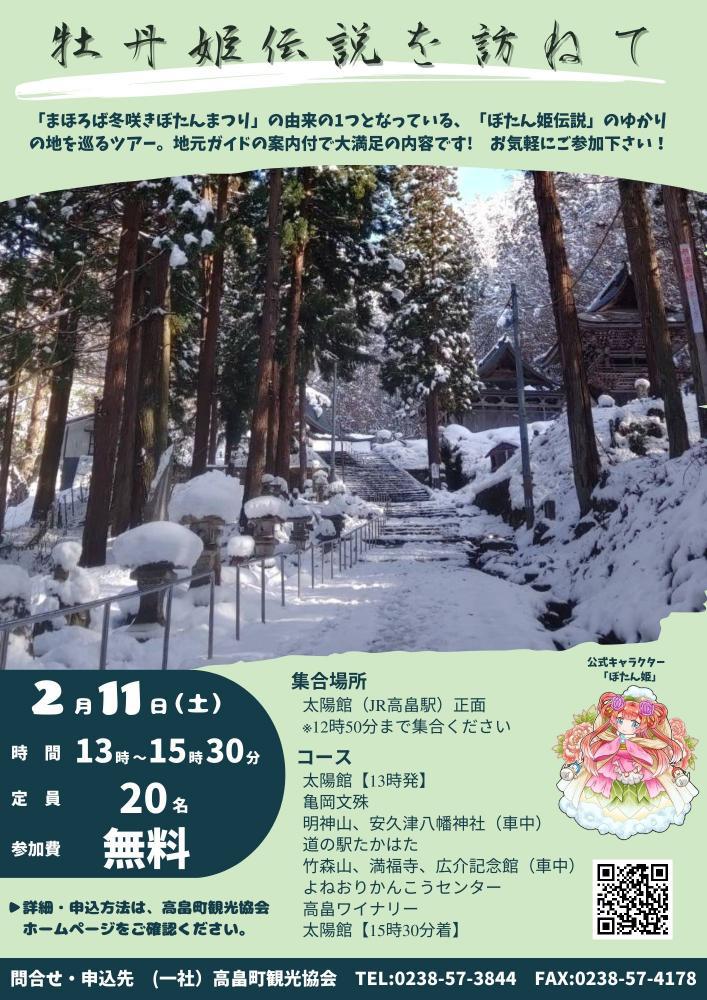 ↑詳細はこちらから第22回まほろば冬咲きぼたんまつりにおいて、町内観光名所を巡る周遊バスを運行いたします!「牡丹姫伝説を訪ねて」高畠町には「牡丹姫伝説」という伝説があり、ぼたんまつりの由来の一つともなっています。その伝説にゆかりのある地と高畠町の観光名所を地元ガイドと語り部がご案内いたします。・日時…2月11日(土) 13時出発 15時30分帰着・料金…無料・定員…20名(予約優先)・行程(天候により変更となる場合がございます。) 太陽館→亀岡文殊(滞在30分)→明神山、安久津八幡神社(車中)竹森山、満福寺、広介記念館(車中)→よねおりかんこうセンター(滞在20分)→高畠ワイナリー(滞在20分)→太陽館・添乗…まほろばの里案内人、まほろば語り部の会〇お申し込み先 高畠町観光協会 ・TEL:0238-57-3844 ・Mail:mahoroba@takahata.info(下記お問合せフォームでもお申し込みいただけます。)  件名に「周遊バス申し込み」と記載し、本文にご希望のコース、人数、代表者の氏名、住所、電話番号をご記載ください。※先着順となっております。ご希望の方はお早めにお申し込みください。