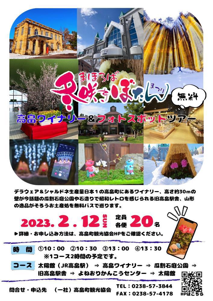 ↑詳細はこちらから第22回まほろば冬咲きぼたんまつりにおいて、町内観光名所を巡る周遊バスを運行いたします!「高畠ワイナリー&フォトスポットツアー」高畠町内で今話題になっている「映えスポット」と山形の逸品がそろうお土産どころをめぐります。ワイン片手に巡ってみませんか?・日時…2月12日(日) 各便所要時間2時間    ・10時 出発    ・10時30分 出発    ・13時 出発    ・13時30分 出発・料金…無料・定員各便20名(予約優先)・行程(天候により変更となる場合がございます。) 太陽館→高畠ワイナリー→瓜割石庭公園→旧高畠駅舎→よねおりかんこうセンター→太陽館・添乗…役場商工観光課または観光協会職員〇お申し込み先 高畠町観光協会 ・TEL:0238-57-3844 ・Mail:mahoroba@takahata.info(下記お問合せフォームでもお申込みいただけます。)  件名に「周遊バス申し込み」と記載し、本文にご希望のコース、人数、代表者の氏名、住所、電話番号をご記載ください。※先着順となっております。ご希望の方はお早めにお申し込みください。