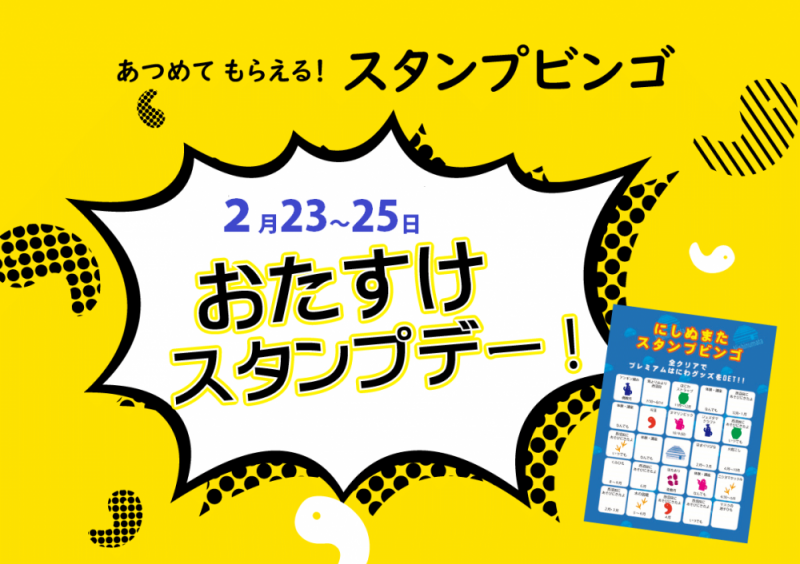 スタンプビンゴでは、来園や体験学習、イベント参加に応じでスタンプを押します。スタンプがタテ・ヨコ・ナナメにそろえばビンゴ!1ビンゴ、2ビンゴ、3ビンゴ、コンプリートでプレゼントがあります。毎月24日は、にしぬまたの日。おたすけスタンプデーは、期日が過ぎてしまったマスにスタンプを1個プレゼントします。今月は特別に23日、24日、25日の3日間開催します。ビンゴ間近という方がたくさんおられると思うので、この機会をお見逃しなく!※おたすけスタンプデーでも、空いているマスの状況によってはスタンプが押せない場合があります。