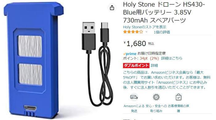 Holy Stone ドローン HS430用バッテリー1本購入しました。バッテリーよりもUSBケーブルがほしかったので。バッテリーは3本付属。充電が100分で、飛行時間が10分ちょっとなので、1本づつ充電するのはめんどくさい。これで2本同時に充電できるし、バッテリーも4本になった。