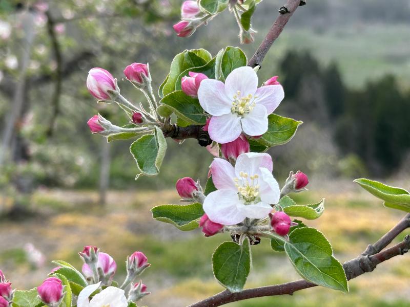周囲の風景の中には、桃の花、菜の花、サクランボの花、リンゴの花が咲いています。その中でも「リンゴの花」がとても可愛い!