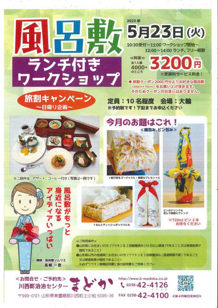 5月23日(火)風呂敷ワークショップ開催!!お好きな風呂敷付き、ワークショップ後、二段弁当でランチ!!旅割ならではの企画です。※予約制です。お申し込みお待ちいたしております♪