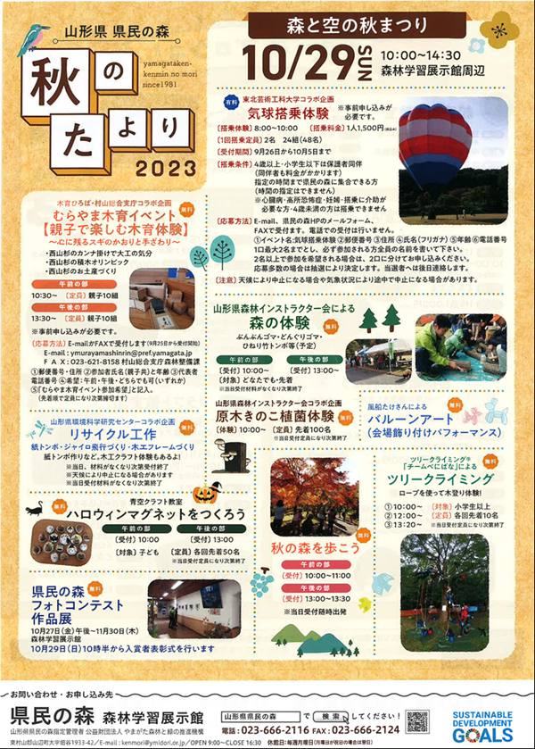 10月29日(日) 県民の森 森林学習展示館及びその周辺にて「森と空の秋まつり」が開催されます。楽しいイベントが盛りだくさんです!ぜひご参加ください。