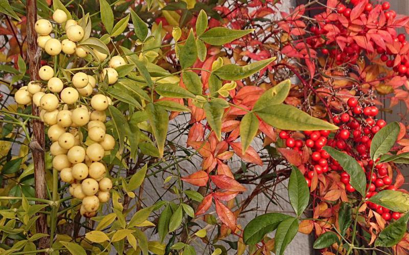 ●お正月が近くなってきました お正月飾りに欠かせないものの一つにナンテンがあります 縁起物のナンテンですが少し黄色味を帯びた白と赤のナンテンを見つけました 今日の午前中は気温は低かったのですが時折陽の射す天候で紅白のナンテンが輝いていました