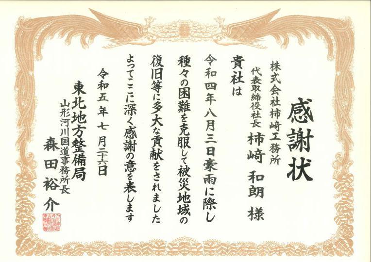 令和5年7月27日に国土交通省東北地方整備局山形河川国道事務所長より、令和5年度国土交通行政関係者功労者表彰式で「災害対策功労者」として表彰されました。