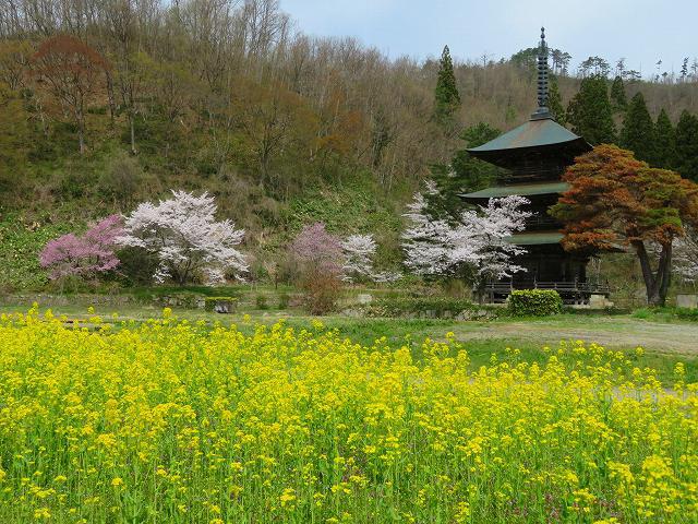 三重塔と安久津八幡神社のある歴史公園一帯の桜、満開です。最近の初夏を思わせる気温で、一気に咲き乱れました♪菜の花色とさくら色のコントラストが、心を躍らせる風景となっております。来週には散り始める気配。この美しさを見にいらしてください♪