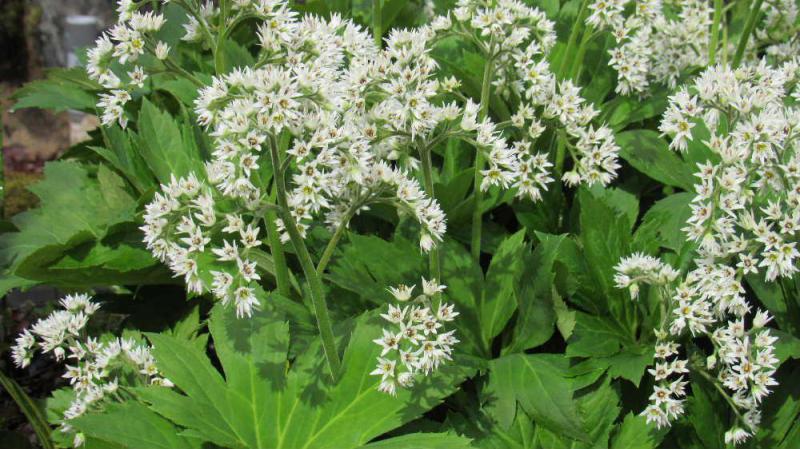 ●道路を挟んだ真向いの庭に真っ白な「イワヤツデ」が咲いています 今まであまり気にもとめずに見過ごしていましたが今年はきれいに咲いておりカメラにおさめさせてただきました ヤツデやモミジを思わせるような葉を広げ 同時に茎をまっすぐに伸ばし上の部分で枝分かれし小さな白い花をたくさん咲かせます 秋には確か葉が枯れてしまっていたような気がします