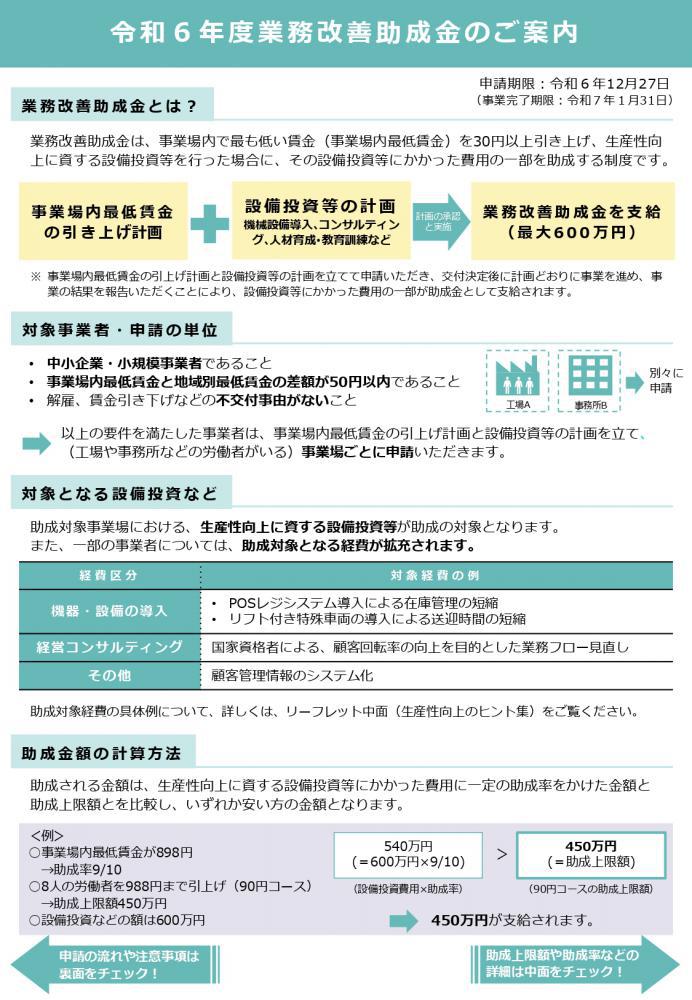 ↑詳細は掲載のチラシをご覧ください。 業務改善助成金は、事業場内で最も低い賃金(事業場内最低賃金)を30円以上引上げ、生産性向上に資する設備投資等を行った場合に、その設備投資等にかかった費用の一部を助成する制度です。申請期限:令和6年12月27日 (事業完了期限:令和7年1月31日)