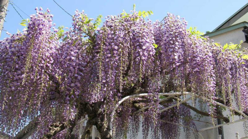 ●夏のような暑さに庭の「フジ」の花が満開になり どこから集まってくるのでしょうかクマンバチが花のまわりを飛び回っています 40年以上過ぎたフジの花ですが今年も咲いてくれました 何も手入れもせずに伸びたつるを切るだけですが毎年咲かせてくれ初夏を彩ってくれます 小さなフジの鉢植えでしたが芽を出し葉が伸びて花が咲き枯れる姿を繰り返し今の大きさになりました