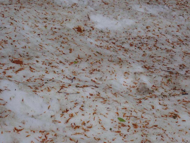 ブナの蕾開花が始まりました。そのため芽鱗か雪上にちりばめられ紅葉どうようの光景が見られるのです。