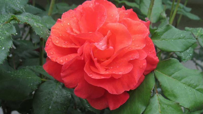 ●雨上がりの庭にバラが一輪咲きました 小さな庭に鉢植えも含め10種15株ほどのバラを育てていますが今年ようやく一輪咲きました 育て方が下手で病気になったり虫が付いたりとあまりきれいに咲いてくれず四苦八苦しています 咲いてからの期間も短くあっという間に散ってしまいますが赤や黄色 などが咲き誇るバラにまんざらではないと一人ニヤついています