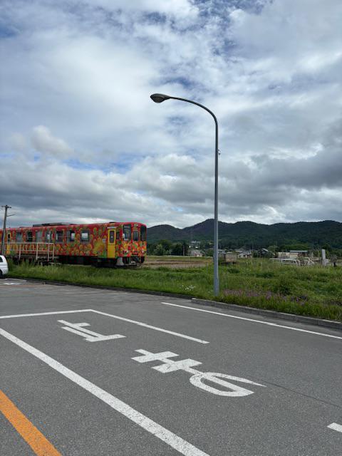 フラワー長井線。今日は紅花模様の列車でした。