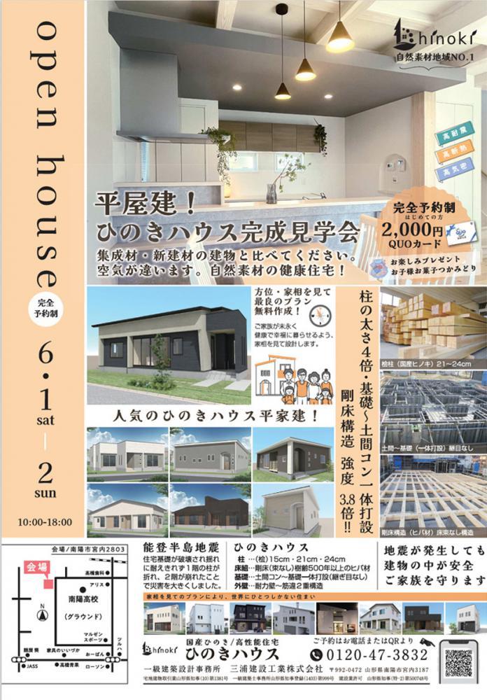 新緑の候 皆様におかれましては、益々ご清祥の事とお喜び申し上げます。 さて、この度、南陽市宮内地区に完成しました「ひのきハウス」の完成見学会を開催いたします。 今回完成した「ひのきハウス」は平屋建の物件ですので、平屋建のマイホームをお考えの方は、ぜひこの機会にご来場ください。 『本物の自然素材の住まい』、柱の太さ4倍、基礎一体打設、剛床構造、外壁2重構造の高耐震、高断熱、高気密に優れた安心・安全・快適な住宅です。 ぜひ、この機会に当社の健康住宅をご体感下さい。  ●日   時:6月1日(土), 2日(日)        10:00〜18:00  ●会場:南陽市宮内2803  ●来場者得点:お子様プレゼント(お菓子のつかみ取り)        お楽しみプレゼント  ●ご連絡先 :0120−47−3832   ※完全予約制となりますので、予めご連絡お願いいたします。    前日までの予約特典 2,000円分のQUOカード ( はじめての方限定 )  三浦建設工業スタッフ一同、皆様のお越しを心よりお待ちしております。
