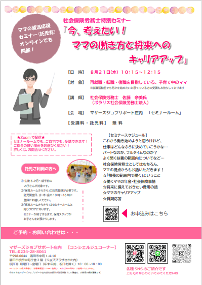 ☆今、考えたい! ママの働き方と将来へのキャリアアップ☆「自分にはどんな働き方があっているのかな?」「よく聞く"扶養の範囲内で"働くって…?」プロとしてはもちろんママの視点からも語る社会保険労務士の話とともに自分の『これから』について考えてみませんか? 【日時】8月21日(水)10:15〜12:15【対象】再就職・転職・復職を目指している子育て中のママ※就職活動前で何かを始めたい方でもOK 【会場】マザーズジョブサポート庄内 セミナールーム        (酒田市中町1-4-10 酒田市役所中町庁舎2階)       またはご自宅でオンライン受講(Zoom) 【料金】受講料 及び 託児料 無料 【定員】@セミナールームでの受講Aオンラインでの受講(随時受け付けております)※@の場合は託児もご利用いただけます。【託児】 ※事前登録・予約が必要です   保育ルーム開室日【水・木・金】の10:00〜16:00に登録にお越し下さい。 ※併設の保育ルームで、保育スタッフが お子さんをお預かりします。 ママは安心して受講いただけます。 ●ご自宅でオンライン受講ご利用の方へ●・インターネット環境が必要になります。 通信料は自己負担です。・パソコン、スマートフォン、 またはたタブレットをご準備いただき、 事前にZoom meetingを ダウンロードしてください。・セミナー中はカメラをオンにし、 お顔の見える状態で受講して下さい。 【駐車場について】   お車でお越しの際は、中町庁舎脇にある   セントラルホテル契約駐車場をご利用ください。(『ジョブプラザさかた』と表示してあります。)      ※契約駐車場が満車の場合は、 酒田市中央地下駐車場をご利用ください。 地下駐車場をご利用の方は、   無料駐車券(最大2時間)を発行いたします。   お帰りの際にコンシェルジュ窓口へお声がけください。どうぞ、お気軽にお問い合わせくださいね。◇お申込み・お問い合わせ◇マザーズジョブサポート庄内TEL:0234-28-8061メールでのお申込みはコチラ