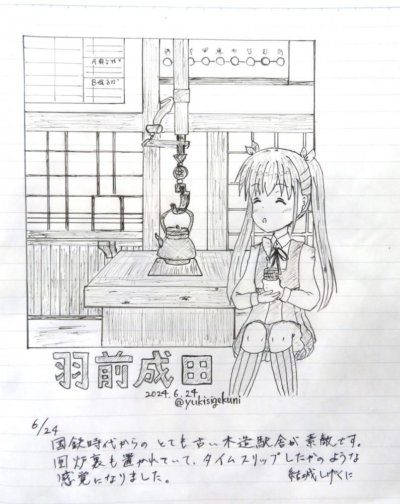 久しぶりにイラスト館の投稿です。今回は、成田駅に初登場の結城しげくにさんの作品です。「国鉄時代からの古い木造駅舎が素敵です」とありますが、古い駅舎の中、女生徒がとても素敵です。結城さんはJKが得意な方のようです。結城さんのSNSなどを調べてみてください。