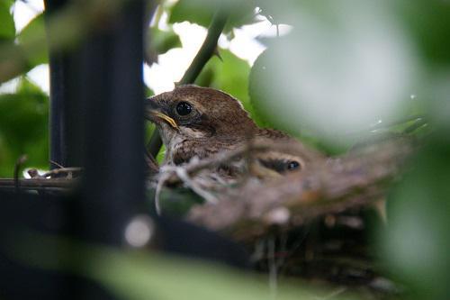 今日も一日中蒸し暑く小雨も降って、変なお天気でしたが、じーじは、バラの剪定に苦戦していました!その脇で、先日見つけたモズのひなが巣立っていったようです。 (トップ写真)は・・・ いなくなる前に、苦労して撮った!ひな鳥!4羽いたようですが、何とか2羽だけ撮れました!これで楽しみも終わりです・・・ ↓こちらは、1羽だけ・・・ おまけに、庭の花達も。。。