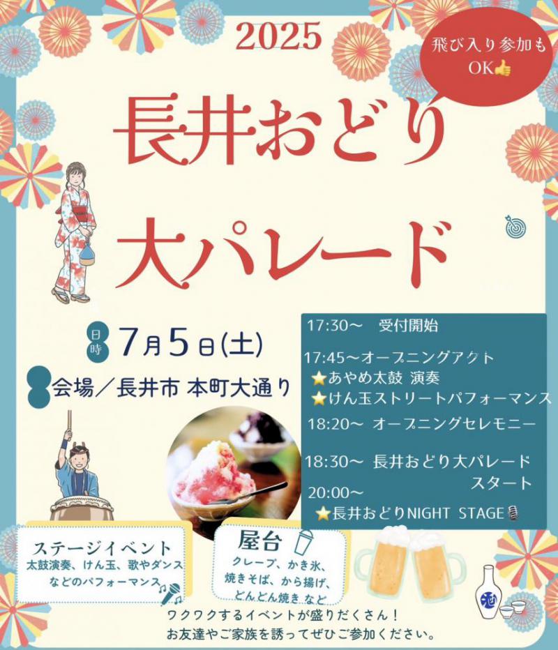 ■期 日   令和7年7月5日(土) ■会場/コース  本町大通り    ◆本町大通り周回コース(中央十字路〜菜なポート 区間) 約300M  周回コース★今年もたくさんの踊り手のご応募いただきありがとうございます! ◎雨天決行 (参加につきましては各団体にてご判断ください)◎大雨、警報・注意報発令の場合は中止。延期はありません。  ■スケジュール  17:45 オープニングアクト     ★あやめ太鼓演奏 18:00 ★けん玉ストリートパフォーマンス 18:30 長井おどり大パレード スタート 19:55 長井おどり大パレード終了 20:00 長井おどりNIGHT STAGE      ★ファムタイズ      ★井上千春 × シークレットゲスト 21:00  イベント終了※スケジュールは参加人数等により前後する可能性があります。 ご参加の皆様には最終のご案内で集合時間・場所等をお知らせします。  ★売店、キッチンカーも来ます! 踊り子の皆さま、最後まで楽しく踊りましょう(^^♪※熱中症対策は、各団体・各自で十分にお気を付けください。 ・゜゚・*:.。..。.:*・*:゚・*:.。. .。.:*・゜゚・**・゜゚・*:.。..。.:*・*:゚・*:.。. .。.:*:.。. .。.:**:.。. .。.:*:.。. .。.:* 【長井市観光協会 公式アカウント】長井市観光協会ではFacebook・Instagramのアカウントを作成しております。是非お目通しくださいませ(*^ω^*)!!FacebookInstagram