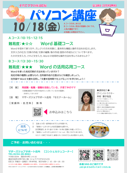 ☆マザーズジョブサポート庄内主催☆就活応援『パソコン講座』のお知らせ10月18日(金)≪Aコース≫ 10:15〜12:15『Word基礎コース』 Wordを初めて使う方や,久しぶりの方を 対象に、基本的な機能と操作方法を お伝えします。 文字入力の仕方/文章の作成/表の作成 図形の作成などについて学べます。 たかが文字入力、されど文字入力 Wordの効率的な操作方法を学んでみませんか? ≪Bコース≫13:30〜15:30『Wordの活用応用コース!』Wordを使った宛名印刷の方法を知っていますか?宛名印刷の種類と必要なもの、住所録作成の注意点などを確認しましょう。住所録やWord文章を活用し、「文章を短時間で仕上げる」コツを学びましょう!この機会に是非マスターしましょう。 ♪片方のコースのみ、両方のコース、どちらの受講でも可能です♪【対 象】再就職・転職・復職を目指している子育て中のママ※就職活動前で何かを始めたいママもOK【会 場】マザーズジョブサポート庄内 セミナールーム【料 金】受講料 及び 託児料 無料【託 児】※事前登録・予約が必要です。保育ルーム開室日【水・木・金】の 10:00〜16:00に登録にお越し下さい。 ※併設の保育ルームで、保育スタッフが お子さんをお預かりします。 ママは安心して受講いただけます。 【駐車場について】お車でお越しの際は、中町庁舎脇にあるセントラルホテル契約駐車場をご利用ください。(ジョブプラザさかたと表示してあります。)※契約駐車場が満車の場合は、酒田市中央地下駐車場をご利用ください。無料駐車券(最大2時間)を発行いたします。お帰りの際に、コンシェルジュ窓口へお声がけください。どうぞ、お気軽にお問い合わせくださいね。 ◇お申込み・お問い合わせ◇マザーズジョブサポート庄内TEL:0234-28-8061メールでのお申込みはコチラ