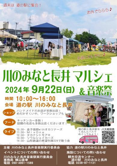 【以下、雨の影響により、残念ながら開催中止となりました】-----------------------------------------------今年も道の駅川のみなと長井にて、「川のみなと長井マルシェ&音楽祭」を開催します。日時:2024年9月22日(日曜日) 10:00~16:00会場:道の駅 川のみなと長井 ハンドメイドのショップやキッチンカーなどフードショップも多数出店いたします。また、ライブも開催します。(時間は下記のものとなります。)10:30~ 金子俊郎withオカリナーズ11:30~ Mixone12:30~ タカナシトモアキ13:30~ ソウルシェイカーズ14:30~ 山形鉄道の希望列車229で歌う会 皆様のお越しをお待ちしております。主催:川のみなと長井音楽祭実行委員会イベントについてのお問い合わせ 事務局電話 090-4691-1589