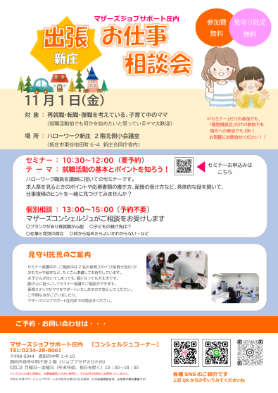 マザーズジョブサポート庄内おしごと相談会in新庄を開催します。 【開催日】11月1日(金)【開催場所】ハローワーク新庄 2階北側小会議室【内容】◎10:30〜12:00 セミナー テーマ「就職活動の基本とポイントを知ろう!」 ハローワーク職員を招いてのセミナーです。 求人票を見るときのポイントや書類の書き方、 面接の受け方など具体的な話を聞いて、 仕事復帰のヒントを一緒に見つけてみませんか? ※お申込みが必要です。 ◎13:00〜15:00 個別相談会 ※どなたでもご利用いただけます お申込みは不要です。 ・おしごとに関するお悩み ・子育てに関すること ・仕事と家事、子育てとの両立 など、お気軽にご相談ください。 ♪お子さんと一緒に、お気軽にお越しください♪お子さんと同じお部屋でセミナーを受講し、相談することができます。保育スタッフが、ママをサポートします。 どうぞ、お気軽にお問い合わせくださいね。 ◇お申込み・お問い合わせ◇マザーズジョブサポート庄内TEL:0234-28-8061メールでのお申込みはコチラ