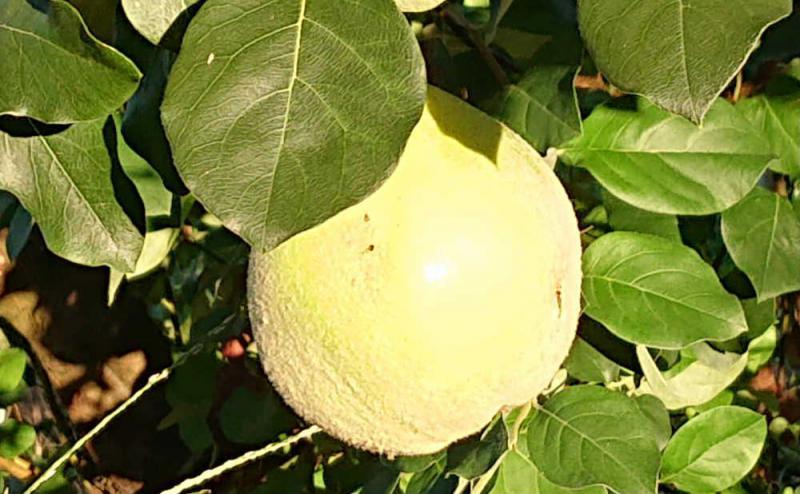 ●果物の季節がやってきました 薄っすらと綿毛のようなものに包まれていますが熟すと黄色になり香りのよい「カリン」が道のそばの畑で少し色づいていました 芳香剤の代わりにしたりカリンシロップの飲み物やカリン酒などで楽しむ人も多いのではないでしょうか でも5月頃の「カリン」の花はリンゴなどに似た薄ピンクの花です こんなに大きな実になることに植物の不思議さを感じます