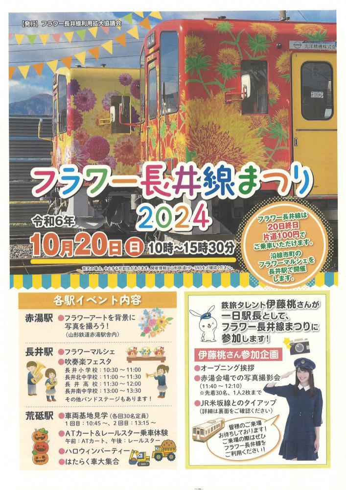 長井線祭り2024のフライヤーが発表されました。今年はJR米坂線の車両を使って今泉駅と長井駅を往復する臨時列車の運行、そして鉄道タレントとして有名な伊藤桃さんが一日駅長や撮影会を行う企画があります。特に伊藤桃さんは、今年になって2回羽前成田駅に遊びに来てくれていますが、今回は山形鉄道の応援団として参加してくれます。とてもうれしいことです。皆さんもぜひご参加ください。  伊藤桃さんとおらだの会の出会いは、こちらから → 伊藤桃さんの「旅物語」:おらだの会 (samidare.jp)   羽前成田駅では11時から大芋煮会、11時15分からオカリナ演奏会、12時からちびっこ大集合・おもちゃをゲット!が行われます。旧駅事務室では10時から14時まで「あの日 あの時へ 〜〜 山形の鉄道情景」展が開催されます。昭和57年から60年の懐かしい風景が甦ります。どうぞお楽しみください。