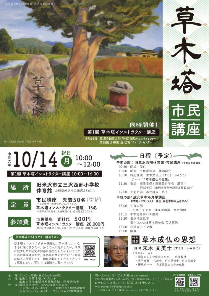 この度、草木塔市民講座及び同時開催 草木塔インストラクター講座が10月14日(月)開催されます。草木塔とは、現在は世界中に分布している石造文化財です。特徴として、「草木塔」「草木供養塔」「一仏成道観見法界草木国土悉皆成仏」と刻まれています。建立は江戸時代(1780年ころ)米沢市田沢地区の塩地平が発祥といわれ、創成期の草木塔は山形県置賜地域に多く分布しています。その建立理由は、まだはっきりとわかっていないものの、「草木国土悉皆成仏」という経文の全国的な使用傾向から墓石である可能性が判明しています。一方で近年は、「草木塔」というイメージから、「草木の霊魂」の存在を認めた上でその霊魂を供養する墓石、石塔と考え、環境保全、SDGsの象徴として注目されています。今回の講座はその多くの草木塔の謎に迫りながら、国際日本文化研究センター 名誉教授の末木文美士(すえきふみひこ)氏によるご講演をいただきその後、地元の研究者を交えた討論会を開催いたします。草木塔 市民講座日 時:10月14日(月・祝日)※事前申込不要(当日受付) 9:30 受付開始 10:00 開校 12:00 終了 場 所:米沢市田沢 旧三沢西部小学校 体育館 山形県米沢市口田沢2361-1 (田沢コミュニティセンターとなり)会 費:市民講座のみ 一人 500円(小・中学生無料) *直接、会場でお支払いください。 定 員:50名程度演 題 「草木成仏の思想」講 師 末木文美士(すえきふみひこ)氏プロフィール 1949(昭和24)年、山梨県甲府市生れ1973年 東京大学文学部印度哲学科卒1978年 東京大学大学院博士課程修了東京大学名誉教授、国際日本文化研究センター教授専門は仏教学、日本宗教史 第1回草木塔インストラクター講座10月14日(月)祝日・11月8日(金) 2日間 基礎講座 開催草木塔インストラクター講座は、草木塔について、さらに深く学びたい、多くの人に紹介したい、 未来に残すための研究や保存に協力をしたいという方のための養成講座です。草木塔の歴史文化を知り、世界に伝える仲間として一緒に活動してみませんか?本講座を受講されることで、草木塔についての基礎知識を現地を見学しながら学び、草木塔インストラクターとしての活動内容をダイジェストでご説明します。今年度の講座では、10月14日(月)祝日と11月8日(金)の2日間に渡って基礎講座が開催されます。10月14日(月)の午前の部は、一般の方と同じ内容を受講します。10/14午後と2日目(11/8)は 申込者だけで米沢市内にある草木塔(田沢地区10/14・万世地区11/8)の2箇所の草木塔の見学学習を行い両日の講座を受講された方に受講終了証を発行します。次年度は、本格的に草木塔インストラクターとして活躍したいという方のためのステップアップ講座になります。事前に基礎講座を受講いただくことで、「自分には合わない」 「思っていたものと違う」といったことがなく安心してご受講いただけます。観光案内や教育現場など、草木塔を案内できるインストラクターとしてをご検討されている方向けに行う講座です。日 時 10月14日(月)祝日・11月8日(金)場 所 米沢市田沢 旧三沢西部小学校 体育館および 田沢地区草木塔 4〜5箇所 田沢コミュニティセンター受講料 市民講座及び草木塔インストラクター 講座料(2日間分) 一人 20,000円(初回プレ講座価格)*事前振り込みで申込完了!(講師料、車代、テキスト代、保険料 含む)お申込み・お支払い方法 ・Peatixサイトから、お申込み・お支払い・口座振り込み(銀行、郵便局) 希望の方はメールにて連絡、後日、振込先をお知らせします。 fuben-ok@zaigotar.club