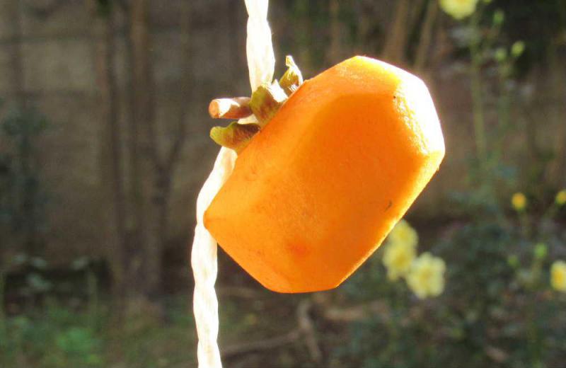 ●柿が陽の光をいっぱいあびて輝いています 近所から柿をいただいたので早速干しガキにしようと皮をむいて軒下につるしました 我が家の干し柿づくりは少しかわき始めた頃焼酎を霧吹きで吹きかけ手でもんでやります これを時々行いあまり固くならないうちに食べるとトロリとしたお菓子のように美味しく食べられます 固くなりすぎて歯がたたない干しガキは高齢者向きではないので