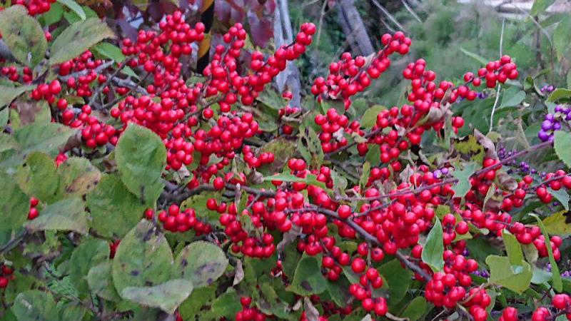 ●真っ赤な実がびっしりと生っていて小鳥がついばみに来そうな花木を散歩中にみつけました「ウメモドキ」でしょうか 葉や花が梅に似ていることから由来したいわれています 落葉しても実をのこしているので晩秋によく目立つ花木のようです「ウメモドキ」でいいのでしょうか