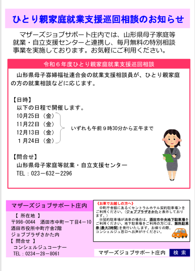 マザーズジョブサポート庄内では、各関係機関と連携し、各種特別相談事業を実施しております。ぜひ、ご利用ください。ひとり親家庭就業支援相談 [要予約]場 所 マザーズジョブサポート庄内 セミナールーム問合せ 山形県母子家庭等就業・自立支援センター пF023-632-2296HP:http://www.y-boshi.com/self-support/ひとり親家庭の方や今後について考えている方、どうぞお気軽にご相談ください。 ※ご利用ご希望の方は、マザーズジョブサポート庄内までお気軽にお声掛けください。※ご相談の際、お子さまの託児は『保育ルーム きらきら』をご利用いただけます。託児ルームのご利用には、事前のご登録が必要です。 【駐車場について】お車でお越しの際は、中町庁舎脇にあるセントラルホテル契約駐車場をご利用ください。(ジョブプラザさかたと表示してあります。)※契約駐車場が満車の場合は、酒田市中央地下駐車場をご利用ください。無料駐車券(最大2時間)を発行いたします。お帰りの際に、コンシェルジュ窓口へお声がけください。 ◇お申込み・お問い合わせ◇マザーズジョブサポート庄内TEL:0234-28-8061メールでのお申込みはコチラ
