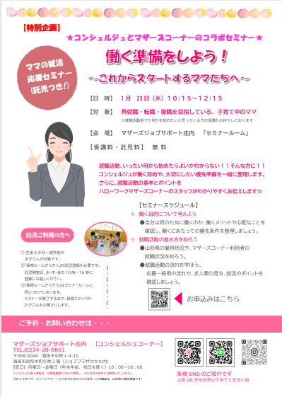 ☆コンシェルジュ& マザーズコーナーコラボセミナー☆『働く準備をしよう!〜これからスタートするママたちへ〜』のお知らせです。「そろそろ本格的に就活の準備始めなきゃ!」と思っていても、分からない…そんなママのために、コンシェルジュが働く目的や大切にしたい優先順位を一緒に整理していきます。 さらに、就職活動についての基本とポイントを就職活動の基本をハローワークマザーズコーナーのスタッフがわかりやすくお伝えします。 【日 時】1月23日(木)10時15分〜12時15分【対 象】就職を目指している子育て中のママ※就職活動前で何かを始めたい方でもOK【会場】マザーズジョブサポート庄内 セミナールーム (酒田市中町1-4-10 酒田市役所中町庁舎2階) 【料金】受講料 及び 託児料 無料 【託児】 ※事前登録・予約が必要です 保育ルーム開室日【水・木・金】の10:00〜16:00に登録にお越し下さい。 ※併設の保育ルームで、保育スタッフが お子さんをお預かりします。 ママは安心して受講いただけます。 【駐車場について】お車でお越しの際は、中町庁舎脇にある〈セントラルホテル契約駐車場〉をご利用ください。(ジョブプラザさかたと表示してあります。)※契約駐車場が満車の場合は、酒田市中央地下駐車場をご利用ください。ご利用の方は、無料駐車券(最大2時間)を発行いたします。お帰りの際に、コンシェルジュ窓口へお声がけください。 どうぞ、お気軽にお問い合わせくださいね。 お問合せはマザーズジョブサポート庄内TEL:0234-28-8061メールでのお申込みはコチラ