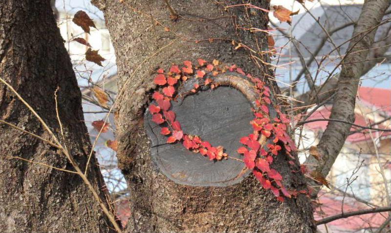●枝を切り落とした株の上にハート型の紅葉したツタ 仲睦ましく写真を撮り合う若いカップルもほほえましく思わず写真を撮ってしまいました 昨日は秋とは思えない気温で何枚も撮った写真の一枚です 晩秋の風景は寂しい季節ですがどこかほっとする風景にたくさん出会えた日でした 今朝は寒い一日となりそうで雪も降りそうだとか 冬支度はおすみですか