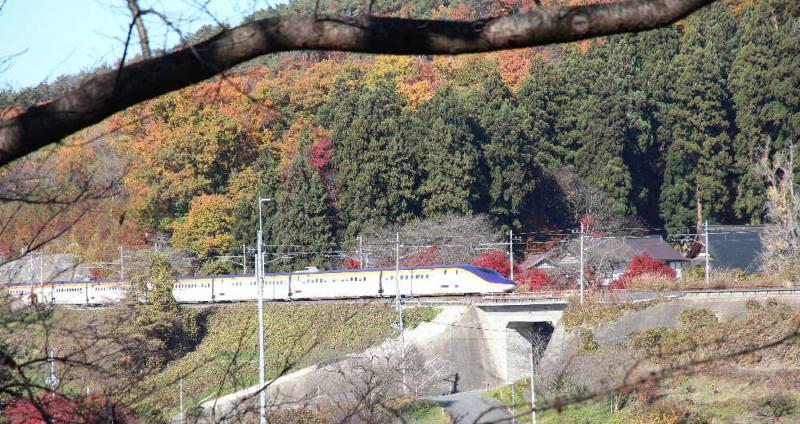 ●山形新幹線の列車が紅葉の山を走り抜けていきました 桜の中を走る列車を撮ったことがあり紅葉の中を走る列車も撮りたいと出向いたのですがすでに桜の葉は全て落ちてしまい葉のない枝の間を走る列車となりました あっという間でシャッターチャンスを逃すとまたしばらくじっとまっていなければならず春と違って寒い季節の撮影は楽ではありません
