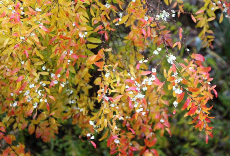 ●たまたま出向いた烏帽子山公園で 冷たい雨が降り今にも雪に変わりそうな空模様の中 紅く染まった葉の中に雪が降ったように白い「ユキヤナギ」が咲いているのを見つけました 初冬の今頃に咲いている「ユキヤナギ」を始めて見ました そういえばブログの訪問者Tさんから烏帽子山公園に「ユキヤナギ」が返り咲きしていましたと教えてもらったことを思い出しました 返り咲きというんですね でも花が寒そうでした