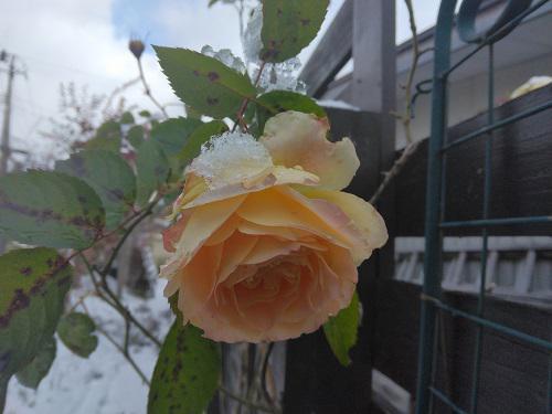 今日の長井の朝は少しの積雪。先ずはひと安心といったところ・・・。ところが米沢市では40p近い積雪、これにはビックリでした。今年も雪のない正月を期待していたのですが大雪の予感がします。 今年の年末年始は9連休なんて言われてますが帰省客にとっては恐怖の正月にならなければと思っているじーじです。 庭は…?もうネタ切れです。来年のために球根や花苗を少し植えています。@ジキタリス ポルカドットポリー(コボレダネでは増えません)Aアリウム(パーティバルーンズ)BユーフォルビアCペルシカリアなど寒さに負けずにきれいな姿を見せてほしいですね。 《トップ写真》まだ頑張っているバラ“シーザー”ばーばのパチリ〜! ↓庭を廻ると雪囲いの中でひっそりと咲いているバラを発見!珍しくじーじのパチリです。“ホワイトクリスマス“です。クリスマスまでにはもちそうにないかもしれませんね。 “シャルール”寒さの中のバラは、また変わった顔色をみせています。 今日は、じーじとばーばの、バラの撮りっこでした。