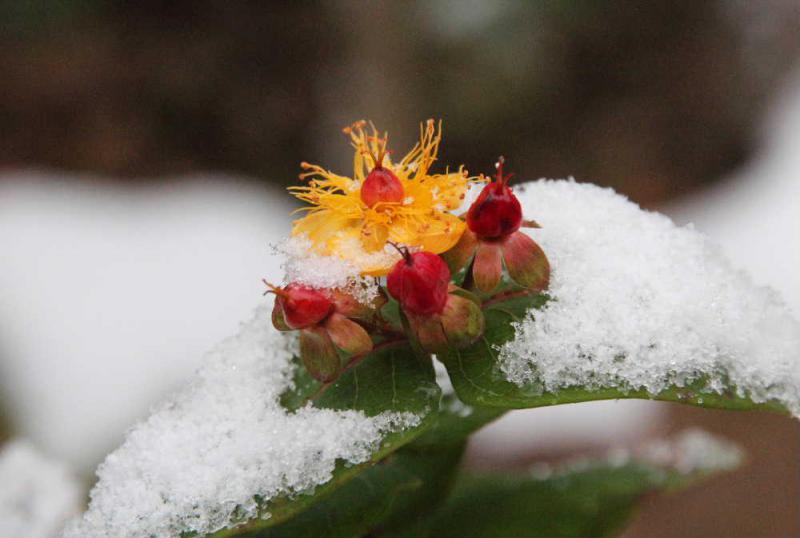 ●サラッと降った雪がのっかった庭のキンシバイがまだ咲いています  いくつかの花が咲き今頃まで花が見られほっとします 雪も降らず例年より穏やかな気候でしょうか 昨日のニュースで西川町の志津温泉の映像がながれました 何と積雪が1m74cmと背丈を超える雪に驚いてしましいました いま庭にはほとんど雪がありません このままお正月を迎えられればと願っていますが無理でしょうね