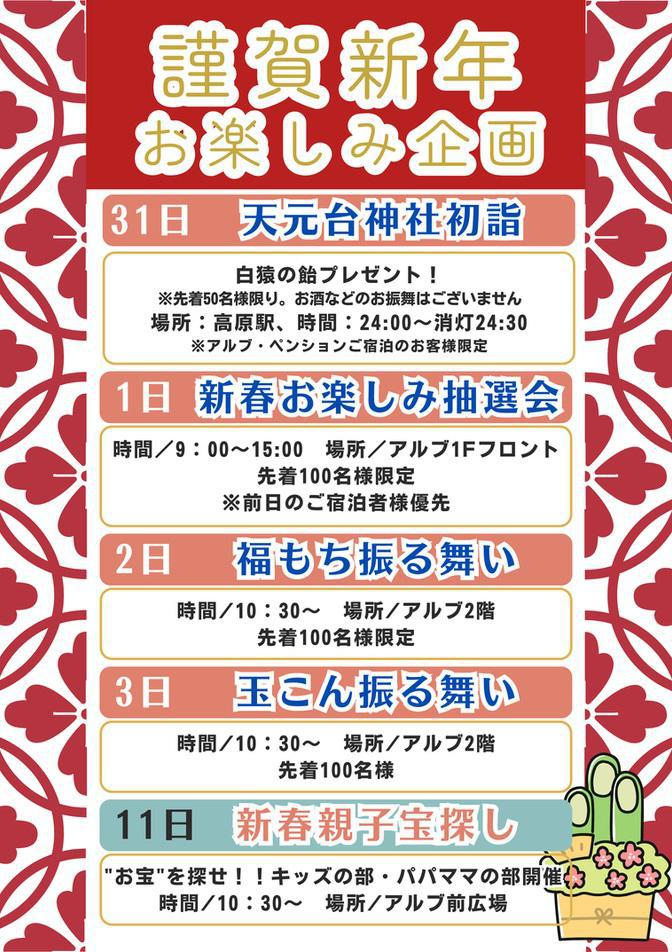 天元台高原で新年順調な滑り出し!毎年恒例の新年お楽しみ企画を実施いたします。イベントに合わせてぜひ遊びにお越しください!【31日】天元台神社初詣 白猿の飴プレゼント!(先着50名様)時 間/24:00〜場 所/天元台高原駅※アルブ天元台・ペンションご宿泊のお客様限定【元日】新春お楽しみ抽選会(先着100名様)時 間/9:00〜15:00、もしくはなくなり次第終了場 所/アルブ天元台1Fフロント※ご宿泊のお客様は優先【2日】福もち振る舞い(先着100名様)時 間/10:30〜場 所/アルブ天元台2階【3日】玉こん振る舞い(先着100名様)時 間/10:30〜場 所/アルブ天元台2階 【11日】新春親子宝探し時 間/10:30〜場 所/アルブ天元台前広場 なお、一部営業時間の変更がございます。合わせてご覧ください。