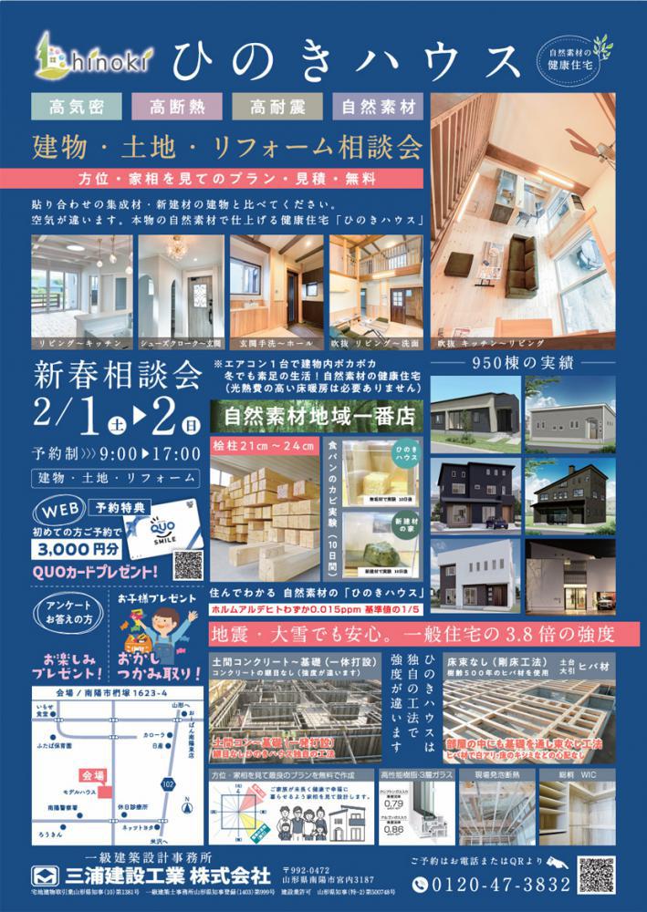 新春の候 皆様におかれましては、益々ご清祥の事とお喜び申し上げます。さて、この度、南陽市椚塚におきまして『秋の住まい 無料相談会』を開催いたします。「高断熱で省エネ」、「高耐震・高耐久で案内」、「世界に一つの家」特化したひのきハウス!マイホームをお考えの方、リフォームをお考えの方、この機会に弊社の無料相談会をご利用くださいませ。スタッフ一同、お待ちしております。 ●日 時:2月1日(土),2日(日) 9:00〜17:00 ●会 場:南陽市椚塚1623−4 ●来場者得点:@お子様プレゼント(お菓子のつかみ取り) Aお楽しみプレゼント(アンケートお答えの方) B前日までの予約特典 3,000円分のQUOカード ( はじめての方限定 ) ●ご連絡先 :0120−47−3832 ※完全予約制となりますので、予めご連絡お願いいたします。 三浦建設工業スタッフ一同、皆様のお越しを心よりお待ちしております。