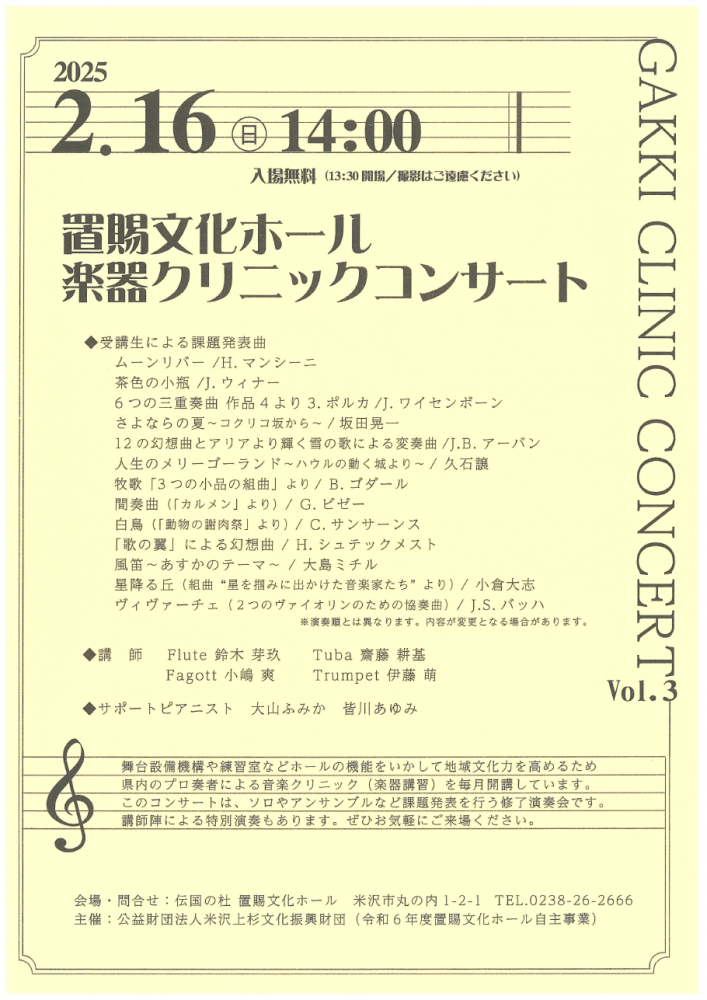 ●【「置賜文化ホール楽器クリニックコンサート」開催のお知らせ】