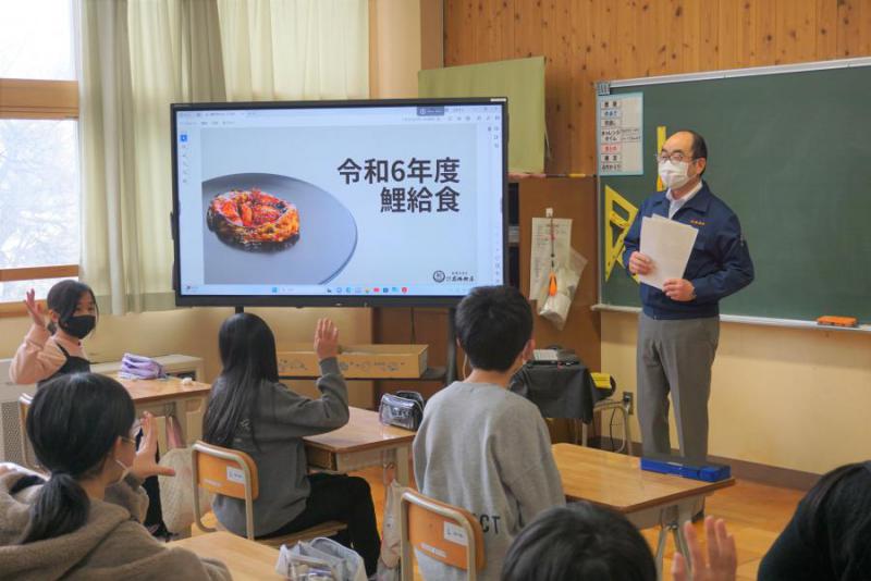 6年生限定でありますが、本日は、致芳地区で営業されている「煖エ鯉屋」さんのご厚意で市内の各学校に提供いただいている「鯉の甘煮」給食の日でした。給食準備の前に、高橋さんから「鯉」に関するお話をお聞きしました。食文化としての鯉料理のこと、上杉鷹山公との関わり、さらには、鯉の養殖が「川鵜」が捕食してしまうことで大変になっていることや鯉料理を食べる機会が減っていること等々、詳しく教えていただきました。さて、実食へ…、初めて食べるという子も少なくなかったようですが、置賜地区の代表的な郷土料理である「鯉の甘煮」をじっくりと味わわせていただきました。6年生にとっては、卒業前の大切な「食の体験活動」となりました。煖エ鯉屋さん、大変ありがとうございました。とても美味しかったです!