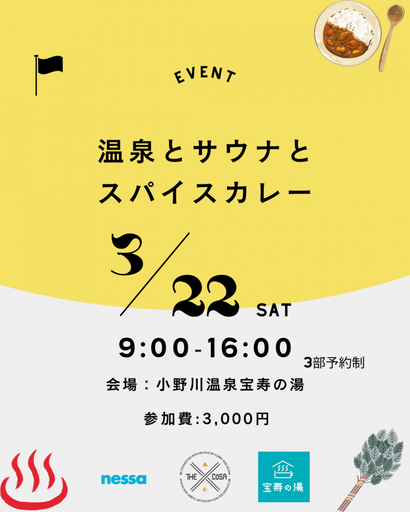温泉×サウナ×スパイスカレーイベントを開催します。年度末の締めくくりに、心も体も温まるひとときを一緒に過ごしませんか?温泉&サウナでしっかり"ととのい"、スパイス香るカレーでリフレッシュ!・開催日時2025年3月22日(土)9:00〜16:00(3部予約制)9:00〜11:00 / 11:30〜13:30 / 14:00〜16:00・開催場所小野川温泉 宝寿の湯山形県米沢市小野川町2584・参加費3,000円(税込)カレー2種盛りをご希望の方は+200円・予約方法https://www.nessa-sauna.com/new上記URLよりお願いします温泉とサウナ、スパイスカレーの最高の組み合わせで、特別なリラックスタイムを過ごしましょう!ご参加お待ちしてます〜