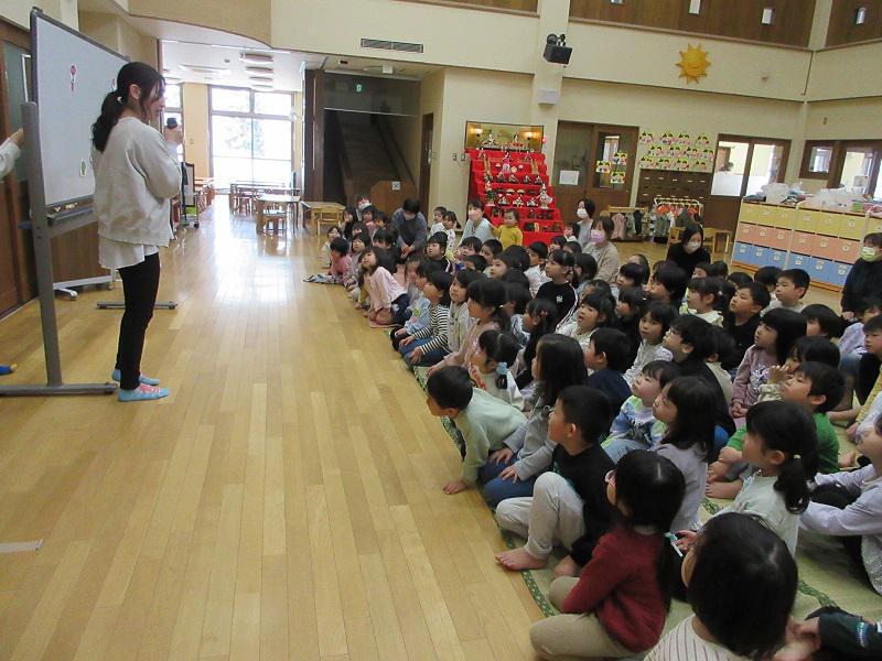 3月3日(月)はひなまつり会がありました。遊戯室には、雛人形や各クラスで製作したお雛様を飾り、賑やかな雰囲気の中で行われました。「うれしいひなまつり」の歌を歌ったり、雛人形やお雛道具の名前や由来についてのクイズに答えたりして、楽しい会になりました。