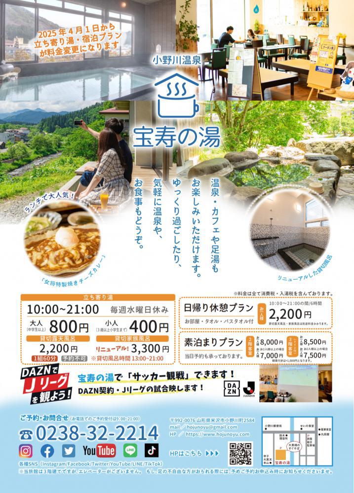 料金改定のお知らせ平素より宝寿の湯をご利用いただき、誠にありがとうございます。このたび、原材料費や運営コストの高騰に伴い、誠に恐縮ではございますが、2025年4月1日より宿泊料金、立ち寄り湯料金を以下の通り、改定させていただくこととなりました。【改定後の料金】立ち寄り湯:大人 800円素泊まり料金:2階客室 (1部屋1名様の場合) 8,000円、(1部屋2名様以上の場合)7,000円 3階客室 (1部屋1名様の場合) 8,500円、(1部屋2名様以上の場合)7,500円 ※朝食付きは+1,000円となります。引き続き、お客様にご満足いただけるサービスを提供できるよう努めてまいります。何卒ご理解賜りますようお願い申し上げます。